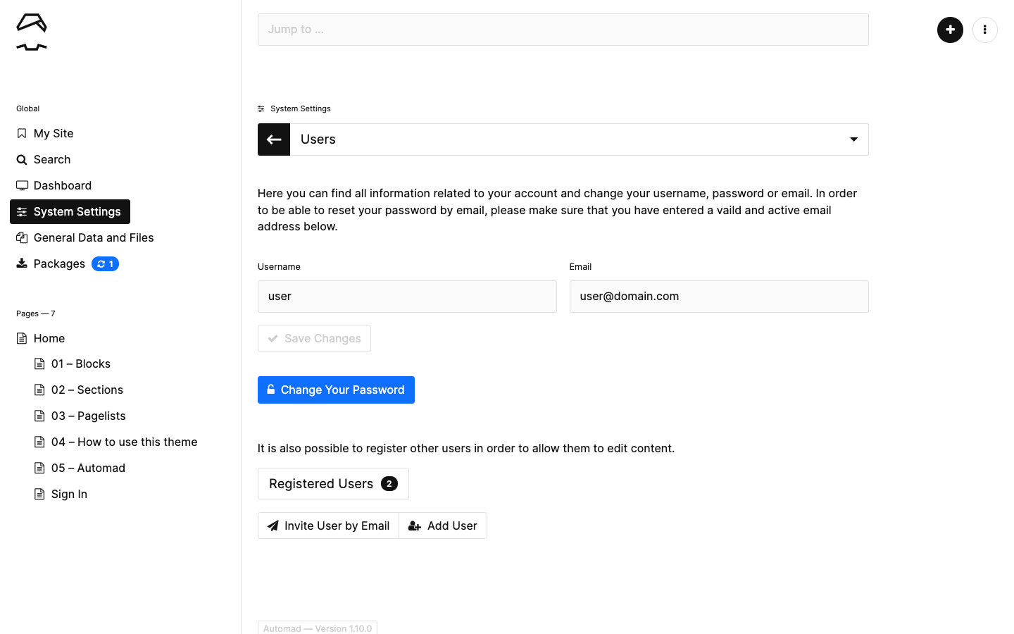 Automad is designed to be extremely configurable. Managing system settings and running updates can be done by using the browser-based dashboard or a simple text editor and the console.