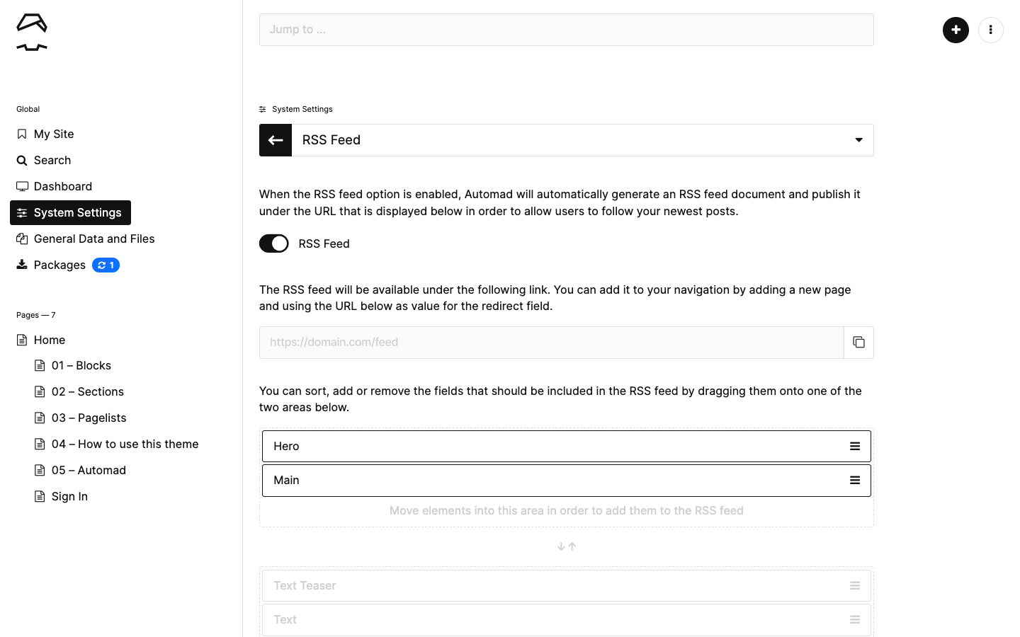 Automad can automatically generate an RSS feed of your pages. The option is enabled by default. The URL of your feed can be found in the feed settings. Just drag any text field from the bottom list to the top one in order to add it to the feed content. To remove a field from the feed, just moved it to the bottom area. Fields can also be sorted.